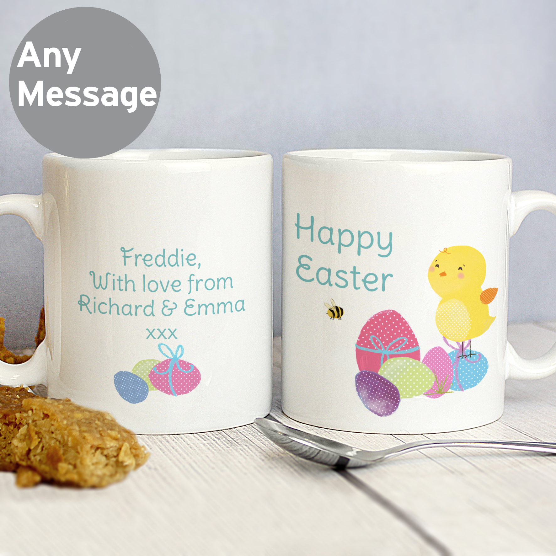 Personalise the from of this Easter Chick Mug with a message over 2 lines of up to 15 characters per line.