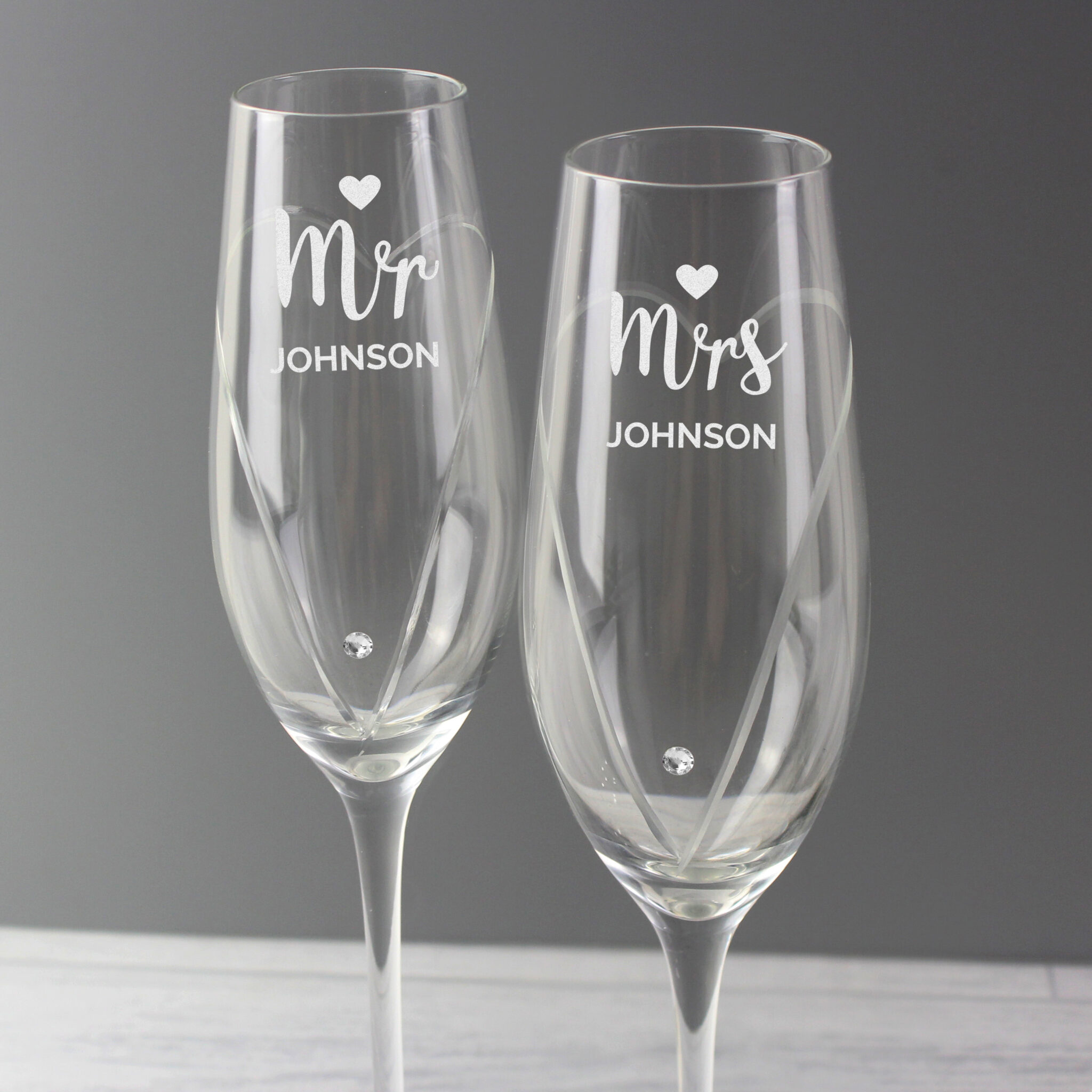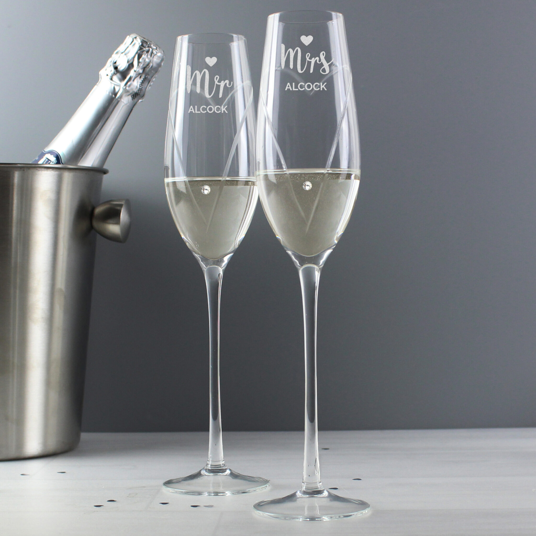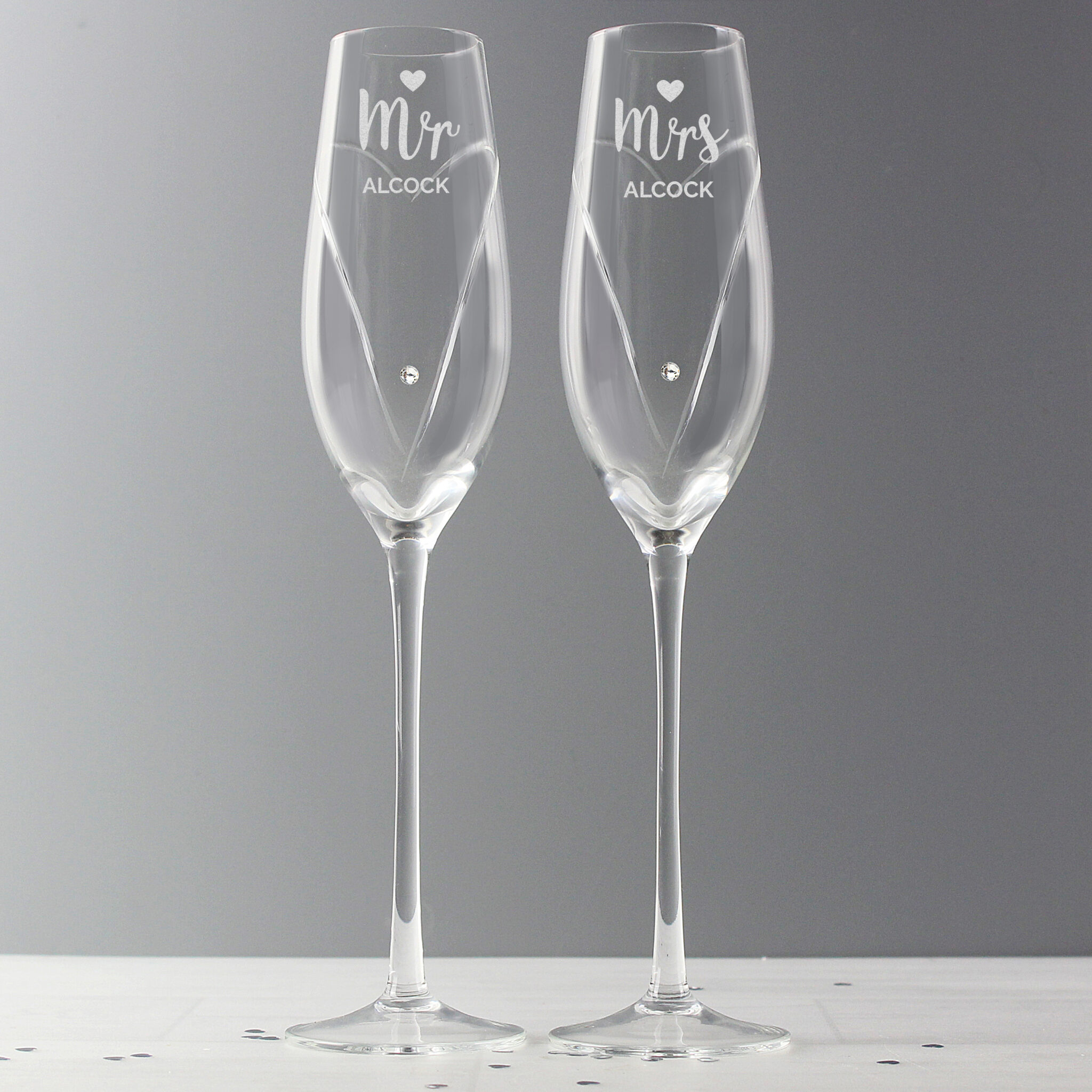 These elegant Personalised Hand Cut Mr & Mrs Pair of Flutes with Swarovski Elements make the perfect gift for newlyweds.